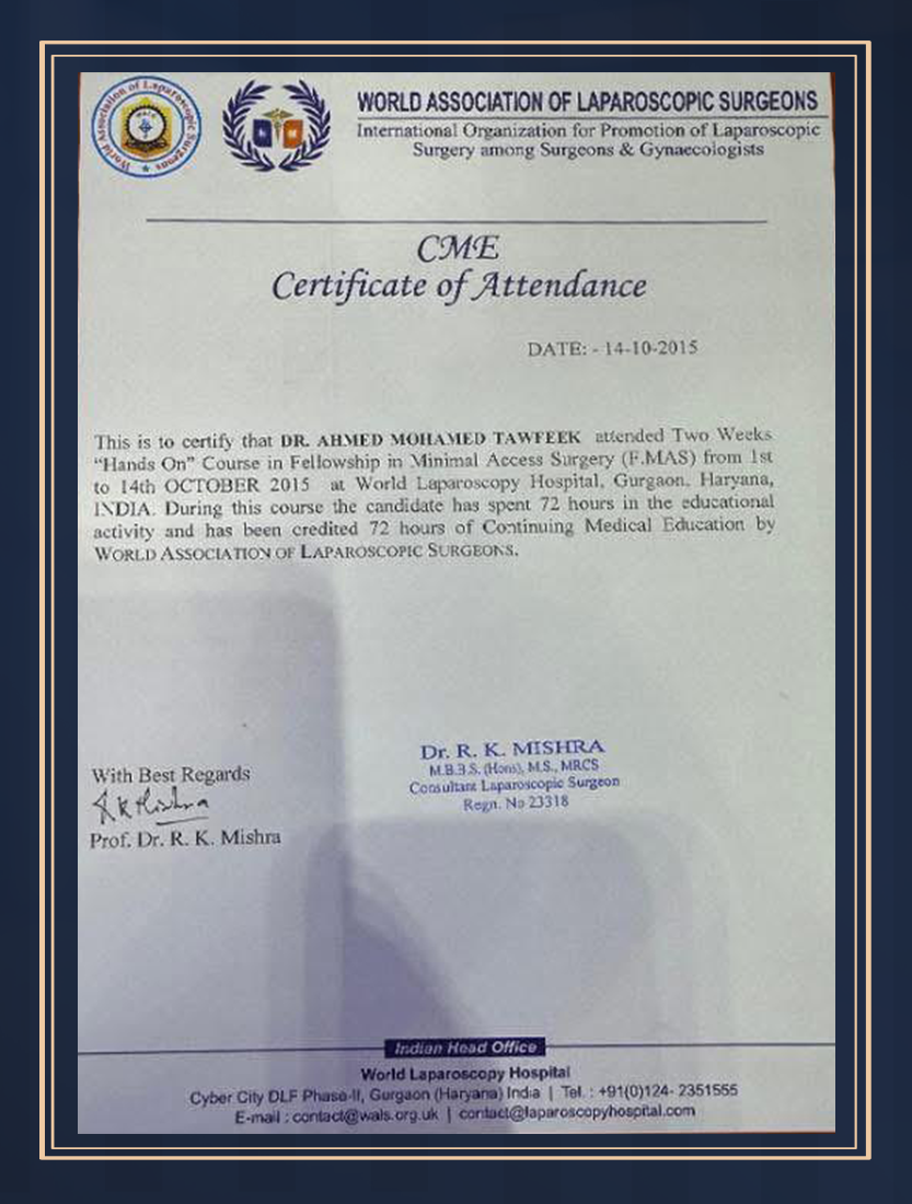 - Fellowship in Advanced Minimally Invasive Urologic Endoscopy from the World Laparoscopy Hospital (WLH), New Delhi, India.