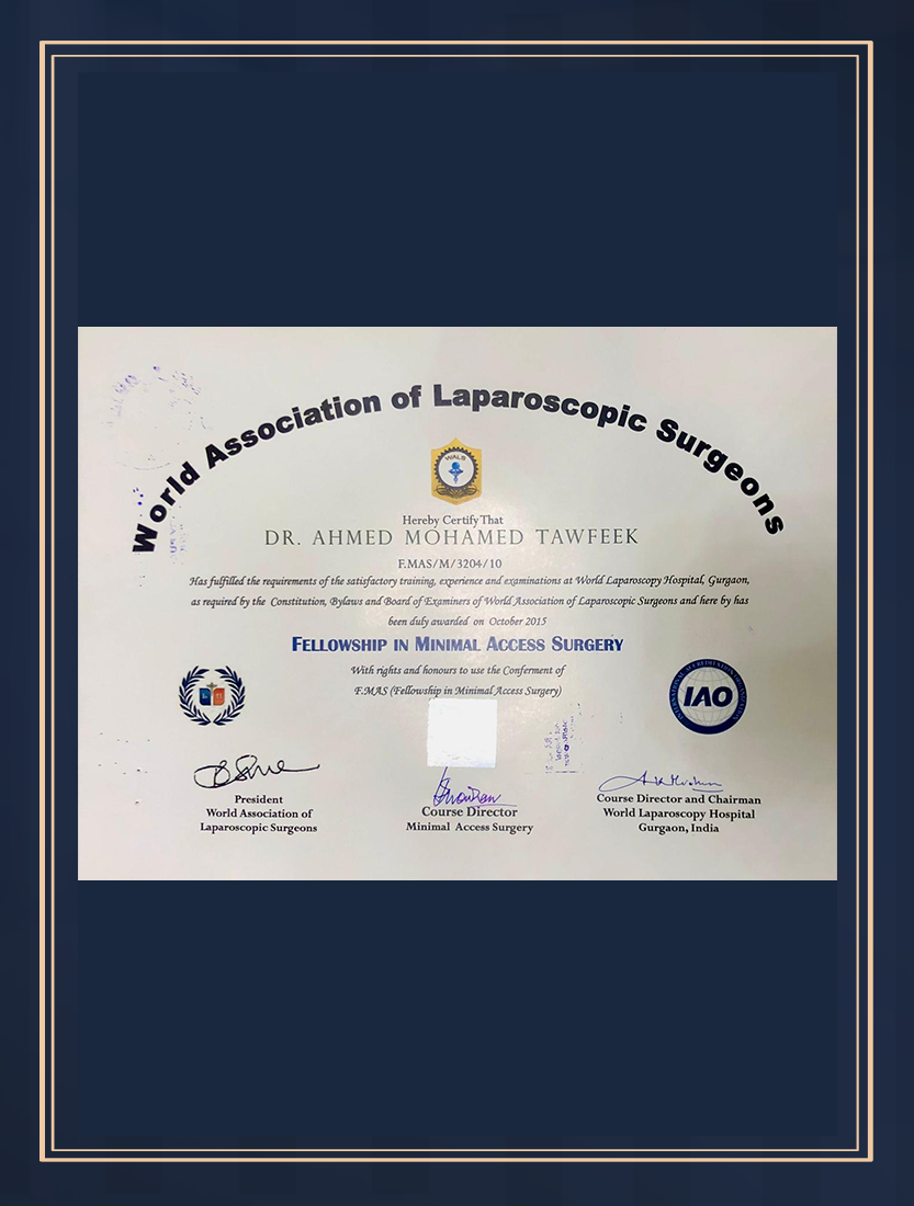Dr. Ahmed Tawfik has obtained a number of accredited certificates and advanced practical training inside and outside Egypt, which directly reflects on the quality of treatment outcomes and patient safety.